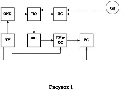 Световые импульсы вводятся в ОВ через ОС. ПОР через ОС иНО поступает на чувствительный ФП, который преобразует оптические импульсы в электрический сигнал. Причем, НО препятствует попаданию светового импульса в ФП до его прохождения по оптическому волокну. После обработки электрического сигнала в БУиОС он подается на вход у осциллографа РС, вызывая в каждый момент времени отклонение луча пропорционально мгновенному значению уровня мощности ПОР. При этом уровень в начальный момент времени Р0 определяется отражением зондирующего сигнала от торца ОВ.