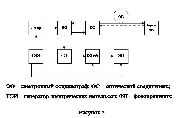 На конце ОВ устанавливается зеркало, отражающее световой импульс с коэффициентом отражения близким к 1. При измерении дисперсии осциллограф работает в ждущем режиме. Он должен иметь достаточную скорость развертки, позволяющую наблюдать импульсы пико - и наносекундной длительности.