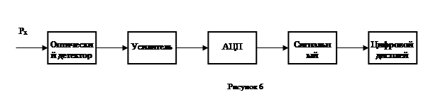 ОД преобразует входной оптический сигнал в электрический, который усиливается и преобразуется к цифровому виду. В сигнальном процессоре производится пересчет полученного электрического сигнала в результаты измерения мощности, которые затем представляются на экране цифрового дисплея.