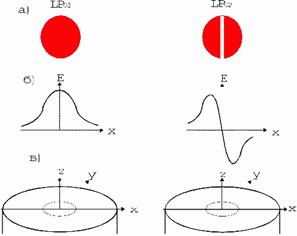 Рис.6. Розподіл інтенсивності по перетині а) і радіальний розподіл поля E б) для мод LP01 й LP11; в) - зріз ОВ (співвідношення діаметра серцевини й оболонки не дотримана).