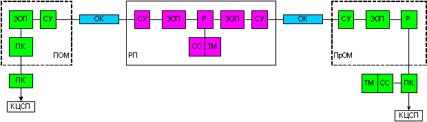 РП – регенерационный пункт, восстанавливает амплитуду, форму, длительность световых импульсов прошедших по ОВ;