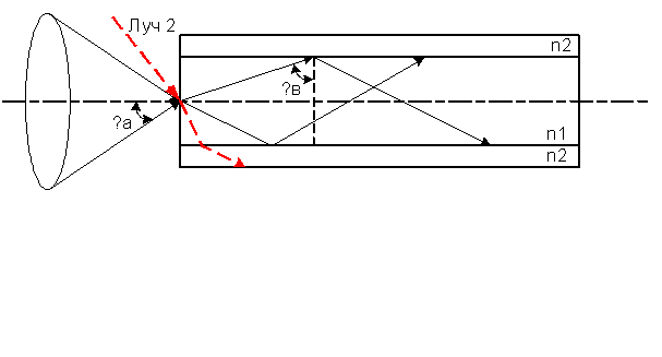 Световые лучи (луч 2), падающие вне апертуры, будут преломляться из сердцевины в оболочку. φП <θВ , следовательно, распространятся по сердцевине ОВ не будут.