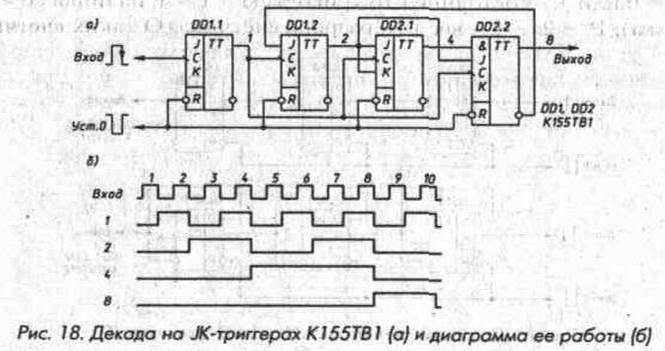 | говорят, что они работают в весовом коде 1-2-4-8. Счетчик может быть построен так, что его весовой код будет отличаться от рассмотренного. Так, для четырехразрядных счетчиков получили распространение коды 1-2-4-6, 1-2-2-4 и др. Существуют такие структуры счетчиков, состояние которых не может быть выражено приведенной выше формулой. О таких счетчиках говорят, что они работают в невесовом коде. Их состояния определяют по временным диаграммам или таблицам переходов. Сказанное о четырехразрядных счетчиках распространяется на счетчики любой разрядности. Делители частоты (далее просто делители) отличаются от счетчиков тем, что в них используется только один выход - выход последнего триггера. Таким образом, n-разрядный двоичный счетчик всегда можно рассматривать как делитель на 2^n. Часто необходимо осуществить деление частоты на некоторое целое число т, не являющееся степенью двойки, в таких случаях обычно используют n-разрядный двоичный счетчик (2^n >m) и вводом дополнительных логических связей обеспечивают пропуск 2^n - m состояний в процессе счета. Этого можно достигнуть, например, принудительной установкой счетчика в 0 при достижении состояния m или принудительной установкой счетчика в состояние 2^n - m при его переполнении. Возможны и другие способы. Например, наиболее часто применяемая декада (счетчик с коэффициентом пересчета 10) нa JK-триггерах К155ТВ1 строится по схеме рис. 18 (а). При подаче импульсов с 1-го по 8-й декада работает как обычный двоичный счетчик импульсов. К моменту подачи восьмого импульса на двух входах J четвертого триггера формируется уровень лог. 1, восьмым импульсом этот триггер переключается в единичное состояние и уровень лог. 0 с его инверсного |