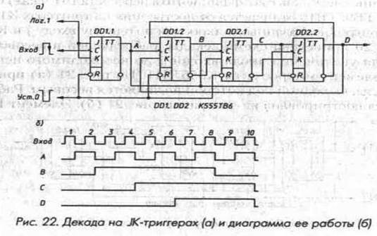 | выхода, подаваемый на вход J второго триггера, запрещает его переключение в единичное состояние под действием десятого импульса. Десятый импульс восстанавливает нулевое состояние четвертого триггера, и цикл работы делителя повторяется. Декада на рис. 18 (а) работает в весовом коде 1-2-4-8. Временная диаграмма ее работы приведена на рис. 18 (б). Декада на D-триггерах, схема которой приведена на рис. 19 (а), работает в невесовом коде. Временная диаграмма ее работы приведена на рис. 19 (б). Построение счетчиков с коэффициентом пересчета 10 (декад) на триггерах ТВ6, ТВ9, ТВ10 отличается от построения на триггерах К155ТВ1, так как у триггеров указанных микросхем по одному входу J и К. На рис. 20 приведена схема декады, работающей в весовом коде 1-2-4-8. Для увеличения числа входов J до необходимого использован один элемент микросхемы К555ЛИ1. На рис. 21 (а) приведена схема декады, выходной код которой не является весовым. Работа декады проиллюстрирована на диаграмме рис. 21 (б). Элемент DD3 не является обязательным, он преобразует код работы декады в весовой код 1-2-4-8 (выходы А, В, С, Е), что может быть необходимым для подключения к декаде дешифратора или преобразователя кода для семисегментного индикатора. |