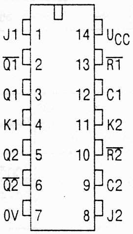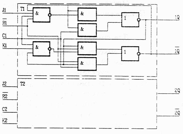 | 3. Описание схемы Микросхема КР1533ТВ6 представляет собой два JK-триггера, срабатывающих по отрицательному фронту тактового сигнала, со входами сброса. Низкий уровень напряжения на входе сброса R устанавливает прямой выход Q соответствующего триггера в состояние низкого уровня напряжения вне зависимости от логического состояния на других входах. При наличии на входе сброса напряжения высокого уровня для правильной работы триггера требуется предварительная установка информации по входам J и К относительно отрицательного фронта тактового сигнала, а также