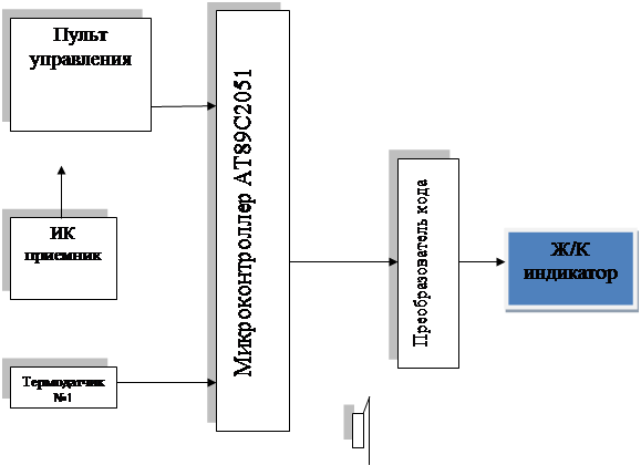 Микроконтроллер, громкоговоритель, Термодатчик, Жидкокристаллический индикатор, ИК- ЛУЧИ