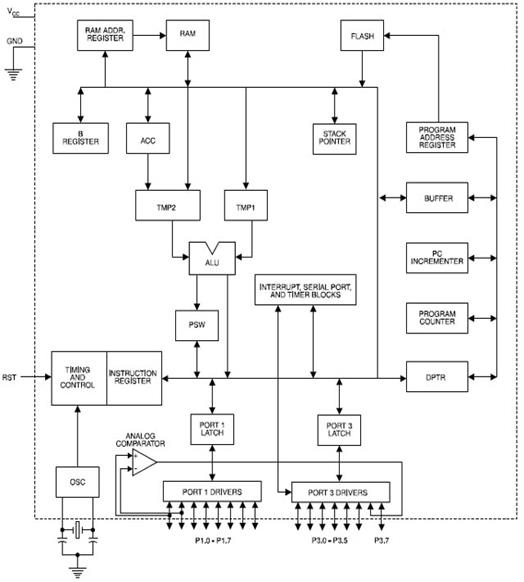 AT89C2051 разработан по технологии КМОП. Микроконтроллер оснащенный Flash программируемым и стираемым ПЗУ, а также совместим по системе команд и по выводам со стандартными приборами семейства MCS-51. Объем Flash ПЗУ - 2 Кбайта, ОЗУ - 128 байтов. Имеет 15 линий ввода/вывода, один 16-разрядный таймера/счетчика событий, полнодуплексный порт (UART) пять векторных двухуровневых прерываний, встроенный прецизионный аналоговый компаратор, встроенные генератор и схему формирования тактовой последовательности. Напряжение программирования Flash памяти - 12 В и ее содержимие может быть защищено от несанкционированных записи/считывания. Имеется возможность очистки Flash памяти за одну операцию и возможность считывания встроенного кода идентификации. Ток потребления в активном режиме на частоте 12 МГц не превышает 15 мА при 6 В и 5,5 мА при напряжении питания 3 В. В пассивном режиме (ЦПУ остановленно, но система прерываний, ОЗУ, таймер/счетчик событий и последовательный порт остаются активными) потребление не превышает 5 мА и 1мА. В стоповом режиме ток потребления не превышает 100 мкА и 20 мкА при напряжении питания 6 В и 3 В, соответственно. Микроконтроллер AT89C2051 ориентирован на использование в качестве встроенного управляющего контороллера.