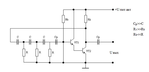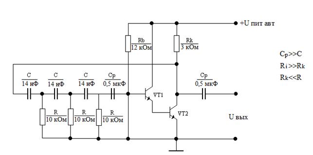 В качестве задающего генератора в работе используются схема на биполярном транзисторе с пассивной RC-цепью обратной связи. Автогенератор собран на составном транзисторе VT