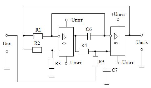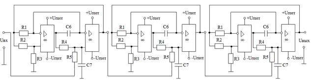 Пусть требуемое выходное напряжение устройства выделения второй гармоники Uвы x треб = 12 В (амплитудное значение). Из предыдущих расчетов известно, что амплитуда напряжения второй гармоники Um 2 = 0,15 В. Тогда амплитуда напряжения на выходе фильтра будет: