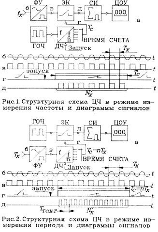 Структура ЦЧ в этом режиме приведена на рис. 2а. В этом режиме время замкнутого состояния ЭК задается периодом (или n периодами). Входной сигнал, период которого Tx измеряется (рис. 2б) так же, как и при измерении частоты, подается на вход ФУ. Выходной сигнал ФУ (рис. 2в) поступает на делитель частоты ДЧ (множитель периодов Tx ). Число n (обычно n - это 1, 10, 102 , 103 или 104 ) выбирается переключателем ВРЕМЯ СЧЕТА, т.е., пТ x . При запуске на выходе ДЧ появляется импульс по длительности равный пТ x (рис. 2г), в течение которого СИ подсчитывает прошедшие за это время импульсы с известным периодом следования T такт (рис. 2д), называемые часто «метками времени».
