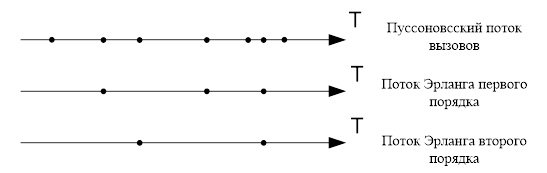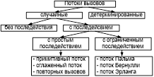 Потоки вызовов бывают детерминированные и случайные. Случайный поток вызовов отличается от детерминированного тем, что моменты поступления вызовов и промежутки времени между вызовами являются не строго фиксированными (как это имеет место для детерминированного потока), а случайными величинами.