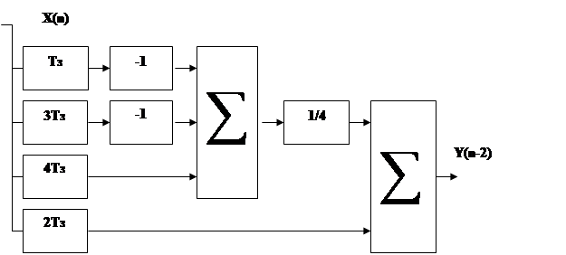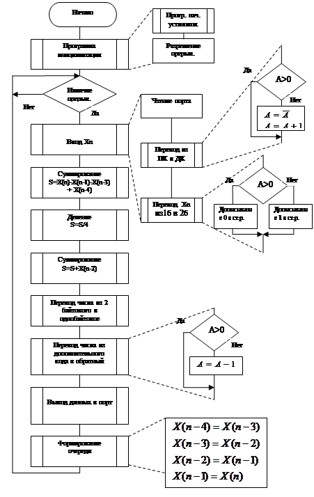 · поскольку при вычислении очередного значения Y(n) используются четыре предыдущих значения входных отсчетов, выгоднее всего использовать подпрограмму формирования очереди, т.е. сдвига поступающих отсчетов, вызываться, которая будет непосредственно после вывода данных в порт.