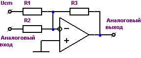 Для согласования диапазона входного сигнала и рабочего диапазона АЦП добавим к нему цепь обратной связи . Также на вход ОУ придется подать дополнительное опорное напряжение для смещения сигнала. Схема инвертирующего включения ОУ представлена на рис.1. Для упрощения расчетов зададим ![]()
