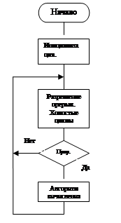 Данные в аккумулятор загружаются из порта ввода по приходу сигнала прерывания RST 7. Работать с прерываниями намного выгоднее, чем реализация постоянного опроса порта о факте наличия данных, поскольку при этом снижаются аппаратные затраты и повышается быстродействие устройства. С учетом этого укрупненный алгоритм функционирования основной программы изображён на рис.4