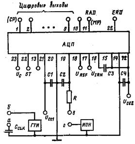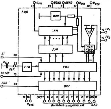 По заданию следует использовать микросхему 10-разрядного быстродействующего функционально законченного АЦП последовательного приближения К1108ПВ1, предназначенную для преобразования аналогового сигнала в двоичный параллельный цифровой код. Микросхемы серии К1108 изготовляются по биполярной технологии, в том числе с применением кремниевых структур с диэлектрической изоляцией, СВЧ транзисторов, элементов ЭСЛ. В состав функциональной схемы преобразователя входят ИОН, ГТИ, выходной регистр с тремя логическими состояниями и функцией хранения информации в течение одного цикла преобразования ВРг РПП, ЦАП, многовходовый КН с входным резисторным вычитающим устройством, дешифратором уровней тока и др. .