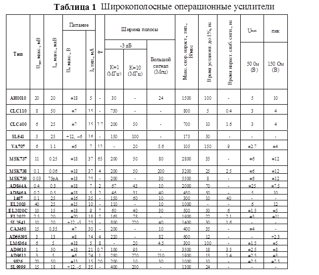 | Имеется также широкий выбор широкополосных операционных усилителей (см.таблицу 1).