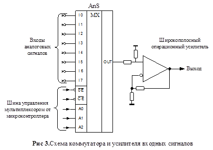 2. Описание принципа действия отдельных блоков. 2.1. Коммутатор и усилитель входных сигналов. Схема состоит из быстродействующего аналогового коммутатора, разрядность которого определяет заказчик(увеличение числа разрядов увеличивает время цикла АЦП, что снижает общее быстродействие схемы) и широкополосного операционного усилителя(здсь приходится идти на компромисс мехду шумовыми характеристиками, смещением нуля, точностью ОУ и максимальной широтой пропускаания). За исключением того, что в данной схеме необходимо использовать компоненты разработанные ведущими производителями полупроводниковых элементов("Motorola", "Philips", "Advantech" и др.), использованны стандартные схемы включения мультиплексора и усилителя. Управление мультиплексором производится от микроконтроллера. |