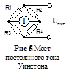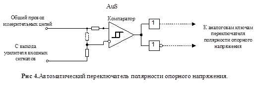 2.2. Схема автоматического переключения полярности опорного напряжения. Схема состоит из "hight-speed"-компараторов и двух буферов, один из которых - инвертирующий. Схема сравнивает полярность входного сигнала относительно "измерительной земли", и при различной полярности воздействует на аналоговые ключи К1 и К2 (Рис. ), изменяя полярность опорного напряжения относительно "измерительной земли" на ту же, что имеет входной сигнал. 2.3. Источник опорного напряжения Источник опорного напряжения использует свойство моста Уитстона - стабильность тока разбаланса моста, при неизменных значениях сопротивлений плеч моста, т.е. Ip =0 при R1*R3=R2*R4(см. Рис. 5 ). |