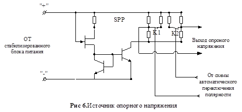 В качестве стабилизатора тока питания моста применина схема "токового зеркала", где для задания коллекторного тока опорного транзистора используется схема источника тока на полевом транзисторе(см. Рис. 6 ). Дополнительные резисторы совместно с аналоговыми ключами в верхних по схеме плечах моста служат для переключения направления тока разбаланса моста, и следовательно полярности опорного напряжения. При температурном градиенте плеч моста, стремящемся к нулю,что решается компактным расположением резисторов моста или интегральным исполнением, ток разбаланса моста обусловливается только сопротивлением нагрузки моста, которе в данной схеме постоянно. |
