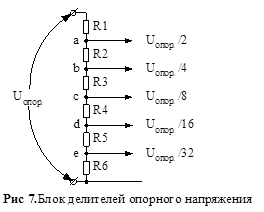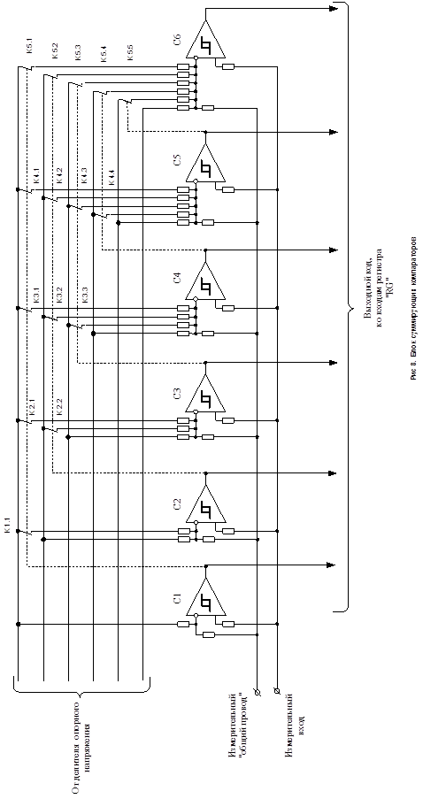 2.4. Блок делителей опорного напряжения. Блок делителей опорного напряжения представляет собой линейку резисторов с отношением сопротивленя следующего резистора к предыдущему как 2/1, т.е. сопротивление резистора R1(см. Рис. 7) равно сумме всех следующих резисторов - R1=R2+R3+R4+R5+R6; сопротивление резистора R2=R3+R4+R5+R6 и т.д. Соответственно напряжение в точке "a" будет равно половине опорного напряжения, в точке "b" - четверти и т.д. 2.5. Блок суммирующих компараторов с аналоговыми ключами для "взвешенного сигнала". Блок компараторов с аналоговыми ключами является ядром АЦП, именно он производит преобразование аналогового сигнала в цифровой код.(Рис 8) Преобразогвание аналогового сигнала в цифровой происходит непрерывно, т.е. любое изменение входного сигнала, за исключением временных задержек схемы, тотчас преобразуется в цифровой код. Схема работает следующим образом. |