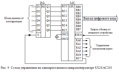 | 2.6. Схема управления на микроконтроллере. Схема управления на микроконтроллере состоит из регистра "RG" 74AC373 или любого функционально аналогичного и однокристального микроконтроллера "MC" типа SX28AC200 производства фирмы "SCENIX" с тактовой частотой 200МГц(см. Рис. 9). |
