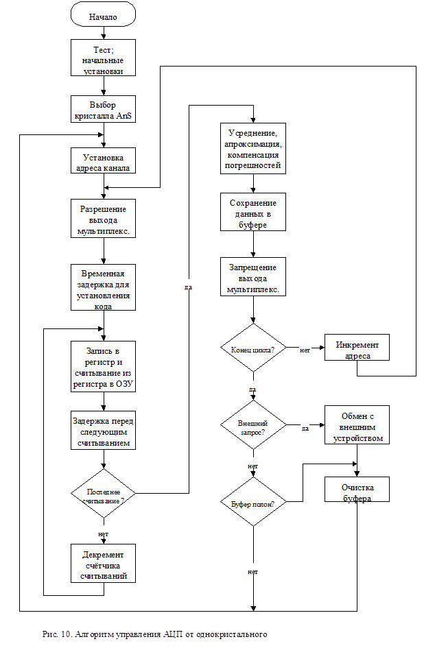 Микроконтроллер после запуска по завершении программы теста и начальных установок (см. алгоритм на рис. 10 ) выбирает мультиплексор AnS вход CE-, выставляет на входах A0-A2 адрес канала I0 и сигналом OE- разрешает передачу входного сигнала I0 на выход OUT мультиплексора, по истечении выдержки времени неоходимой для установления кода на входах регистра "RG" микроконтроллер даёт команду записи в регистр, из которого считывает данные во внутренее ОЗУ, после чего следуют програмно-заданное кличество циклов выдержки времени, записи в регистр и переноса в ОЗУ. Далее сигналом OE- запрещается передача со входа I0 на выход мультиплексора, устанавливается на входах A0-A2 адрес следующего канала и производится цикл преобразования и считывания. По окончании цикла поледнего считывания канала микроконтроллер производит завершение операций по обработке полученых значений и сохраняет данные в буфере. Далее запрещается передача входного аналогового сигнала на выход мультиплексора и если считан не последний канал, то инкрементируется адрес канала мультиплексора и продолжается цикл чтения и преобразования. По завершении цикла обработки последнего канала проверяется был ли запрос на обмен от внешнего устройства, если да то производится обмен и очищается буфер, иначе буфер проверяется на переполнение и при необходимости очищается, после чего весь цикл повторяется. |