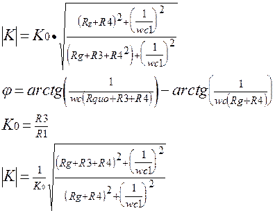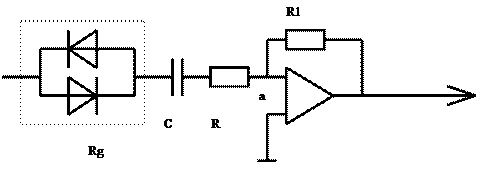 В точке а усилителя напряжение приблизительно равно 0, т.к. коэффициент усиления О.У. велико - 105. Для того, чтобы Ua=0 токи через R1 и цепь Rg, C, R приблизительно одинаковы. Входное сопротивление источника сигнала велико и ток в R1 не протекает.