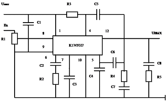 Рис. 9 Усилитель мощности К174УН7 схема электрическая, принципиальная.