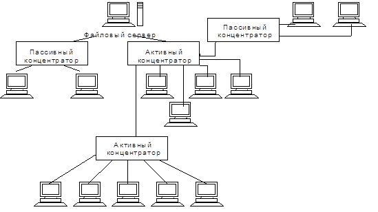 Вычислительные сети с древовидной структурой применяются там, где невозможно непосредственное применение базовых сетевых структур в чистом виде. Для подключения большого числа рабочих станций соответственно адаптерным платам применяют сетевые усилители или коммутаторы. Коммутатор, обладающий одновременно и функциями усилителя, называют активным концентратором.