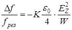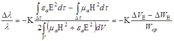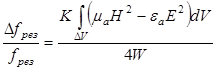 Здесь Е и Н - напряж еннос ть электри ческого и магнитного полей в месте ра сполож ения возму щающ его тела; W - электромагнитная энергия, зап асенная в резонаторе, Δ V - объ ем возму щаю щего тела; f рез - резона нсная частота ; Δ f рез -измен ение резонансной частоты Δ f = f i – f рез (fi - резонансная частота пр и введении воз муща ющего тела ); к - ко эффициент, за висящий от фо рмы, мате риала воз муща ющего тела и о риента ции его относит ельно э лектромагнит ного поля ; ε a и μ a - ди эле ктрическая и магнитная проницаем ость сред. Интегр ал в чи слителе соот ве тствует разност и магнитной и элек тр ичес кой энергии, запасенных в возмущенном об ъе ме.