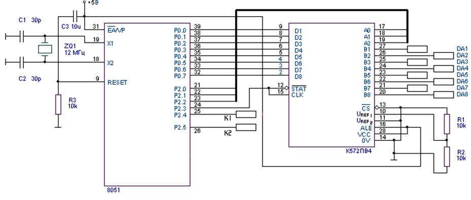 Термостат выполнен на однокристальном микроконтроллере Intel 8051. В качестве многоканального АЦП был выбран 8ми канальный АЦП К572ПВ4.