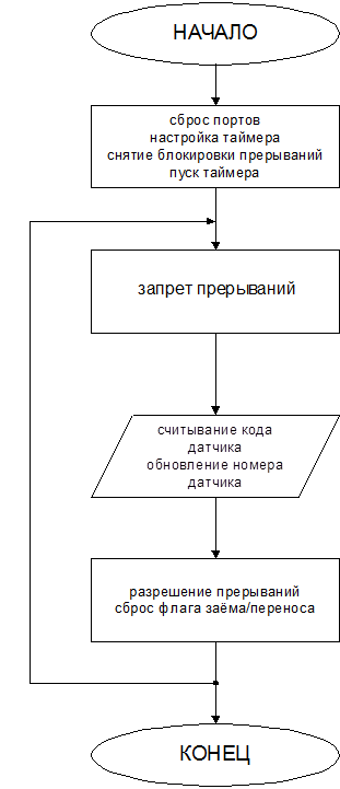 Датчики опрашиваются с периодом 320 мкс (если температура всех датчиков находится в заданных пределах). Выбор датчика осуществляется при помощи сигналов Р2.0-Р2.2. Если температура какого-либо датчика окажется за границами заданной области, то включается один из исполнительных элементов (подключены к Р2.4 и Р2.5), и продолжается контроль данного датчика до тех пор, пока температура не придет в норму.