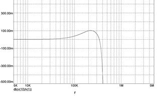 Результаты моделирования фильтра (ОУ типа 140УД26) при минимизации влияния частоты единичного усиления ОУ в полосе пропускания (0–300 кГц) приведены на рис. 15 и 16.