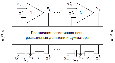 В общем случае произвольное по своему функциональному назначению и структуре ARC-устройство можно рассматривать в виде совокупности N дифференциальных операционных усилителей и n RC-цепей первого порядка, связанных между собой посредством коммутатора, в состав которого могут входить только резистивные делители и сумматоры (рис. 3).