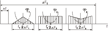 где zk Fв k =2ΔFk – полоса частот, занимаемая k-ым канальным сигналом; zk – коэффициент, определяемый способом модуляции поднесущей сообщением λk , спектр которого имеет полосу Fв k ; Z – коэффициент, определяемый способом модуляции поднесущей групповым сигналом; δƒk – защитный интервал между соседними спектрами; Δƒ – нижняя граничная частота спектра многоканального сообщения.