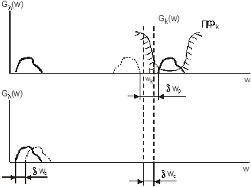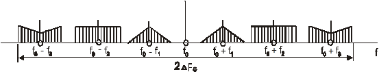 Метод ОБП с подавленной несущей оказывается наиболее экономичным с точки зрения использования спектра частот, поскольку в этом случае ширина спектра канального сигнала ΔFk равна ширине спектра сообщения Fв k . Отсутствие поднесущей при ОБП дает возможность увеличить мощность боковой полосы и тем самым обеспечить наибольшую помехоустойчивость по сравнению с другими способами АМ. Недостатком ОБП является необходимость построения на приемной стороне генератора поднесущей. Чтобы искажения сообщения были минимальны, требуется точное совпадение поднесущих на передающей и приемной сторонах. При наличии сдвига частоты δωс в канале происходит смещение спектра восстановленного сообщения на δωс (рис. 2.1.5), приводящее к искажению сообщения. Для исключения смещения спектра необходимо обеспечивать стабильность и синхронность генераторов.