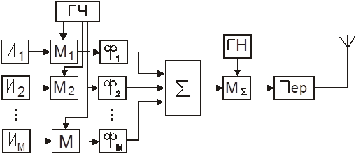 Для формирования канальных сигналов с неперекрывающимися спектрами осуществляется перенос спектров сообщений с помощью канальных модуляторов (Мi ). На каждый модулятор подаются сообщение λk (t) и колебание sk (t)=ak cos(ωk t + φk ) от генератора поднесущих частот (ГЧ) (рис. 2.1.2). Канальные сигналы подаются на фильтры, полосы которых согласованы со спектрами этих сигналов. Фильтры подавляют гармоники, образующиеся в канальных модуляторах. В суммирующем устройстве складываются канальные сигналы, и групповой сигнал, спектр которого показан на рис. 2.1.1,б, модулирует несущую, вырабатываемую генератором (ГН). На выходе модулятора МΣ образуется радиосигнал с несущей ω0 .