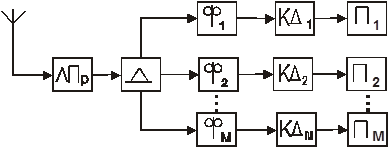 На приемной стороне после усиления и преобразования сигнала в ЛПр производится выделение группового сигнала с помощью демодулятора (Д). Групповой сигнал подается на устройство разделения, состоящее из параллельно включенных фильтров Ф1 , Ф2 ,…, ФМ . На рис. 2.1.1,б параболами обозначены характеристики затухания фильтров. На выходе каждого фильтра выделяется соответствующий канальный сигнал вместе с продуктами взаимных помех и шумами. Канальные демодуляторы (КДi ) выделяют переданные сообщения, направляемые далее получателям Пi .