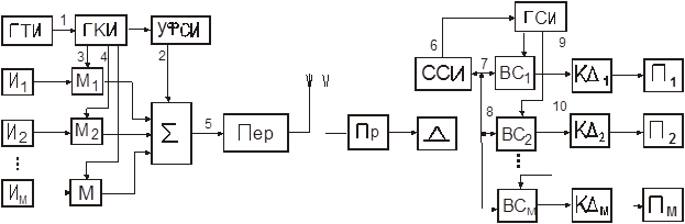 Для того чтобы обеспечить разделение каналов, на передающей стороне устройство формирования синхроимпульсов (УФСИ) вырабатывает синхроимпульсы, параметры которых отличаются от канальных импульсов, а период повторения совпадает с периодом Тп . Синхроимпульсы складываются с канальными, и суммарный поток подается модулятор передатчика. Ритм работы всей системы обеспечивается генератором тактовых импульсов (ГТИ). В передатчике реализуется вторая ступень модуляции, в результате чего формируется радиосигнал.
