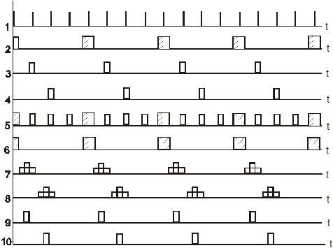На приемной стороне этот радиосигнал демодулируется и на выходе демодулятора (Д) выделяется импульсный поток группового сигнала. Селектор синхроимпульсов (ССИ) выделяет из этого потока синхроимпульсы, которые обеспечивают синхронную работу генератора селекторных импульсов (ГСИ). Разделение канальных импульсных потоков осуществляется временными селекторами (ВС), на которые с одной стороны подается групповой сигнал, с другой – селекторные импульсы. При совпадении по времени канального и селекторного импульсов ВС пропускает первый на вход канального демодулятора (КД). Селекторные импульсы показаны на диаграммах рис. 2.2.3 совмещенными с канальными импульсами на входе ВС (диаграммы 7 и 8). Нумерация диаграмм на рис. 2.2.3 соответствует отмеченным на рис. 2.2.2 точкам. Исходя из работы системы с ВРК, можно сделать вывод об исключительно важной роли синхронизации. Канал синхронизации должен обладать повышенной помехоустойчивостью, чтобы исключить неправильную работу системы в целом.
