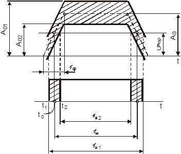 Определим помехоустойчивость систем с ВРК, использующих простейшие канальные демодуляторы – ФНЧ. Пусть на входе демодулятора действует сумма сигнала sk и гауссовского шума n(t) с дисперсией σ2 п . Сигнал представляет последовательность импульсов, форма которых отличается от прямоугольной, поскольку при прохождении по тракту передачи фронты импульсов затягиваются. Для упрощения расчетов заменим сложные по форме импульсы на входе ФНЧ трапецеидальными, имеющими амплитуду А0 и длительность фронта тф . Длительность фронта определяется максимальной крутизной реального импульса. На рис. 2.2.4 пунктиром изображен импульс сигнала и одна из реализаций помехи n. Действие помехи приводит к искажению формы импульса. Возможные реализации суммы сигнала и помехи находятся внутри заштрихованной области. Эта область определяется пиковым значением помехи |Uп max |, которое можно принять равным 3σп . Таким образом, действие помехи приводит к появлению паразитной модуляции импульсов по амплитуде и фазе.