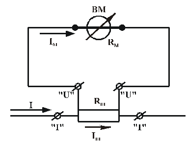 Опір шунта Rш при вимірюванні великих струмів І багато менший від опору вимірювального механізму Rм , тому велика частина вимірюваного струму І йде через шунт (Іш ), а струм Ім через рамку механізму не перевищує припустимого значення І0 . Для зменшення впливу опору контактів і підвідних проводів шунти виробляються з чотирма затискачами: струмовими (“І”‑“І”) та потенціальними (“U”‑“U”).