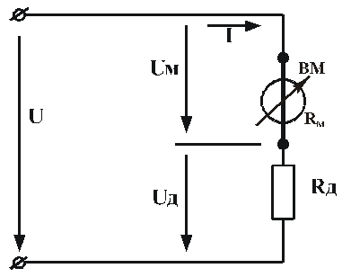 Для одержання магнітоелектричного вольтметра послідовно з механізмом вмикається додатковий резистор Rд (рис.2.6), який обмежує струм в рамці механізму до припустимих значень.