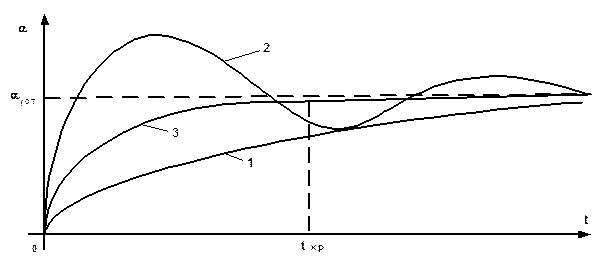 При великому Rз характер руху коливальний недозаспокоєний (крива 2 на рис. 2.7). При опорі зовнішнього кола Rз = Rкр , який називається критичним, рухома частина заспокоюється, тобто зупиняється, повернувшись на кут aуст за мінімально короткий час tкр . Режим руху в цьому випадку також називається критичним (крива 3 на рис. 2.7).