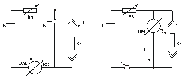 Існують дві схеми омметрів: одна – з послідовним вмиканням вимірюваного опору Rх та вимірювального механізму ВМ (рис. 2.8, а ), інша – з паралельним (рис. 2.8, б ). Для омметра з послідовною схемою струм через вимірювальний механізм (при ненатиснутій кнопці Кн) дорівнює:
