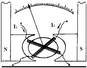 Проміжок між осердям та полюсними наконечниками в цьому механізмі нерівномірний, отже, магнітне поле у проміжку також нерівномірне. Струми І1 та І2 , які протікають в рамках, створюють два обертальних моменти, які направлені назустріч один одному. Під дією різниці між двома моментами рухома частина повертається. Оскільки поле нерівномірне, то при повороті рухомої частини один з моментів збільшується, а інший – зменшується і при певному куті повороту моменти стають рівними один одному, а рухома частина зупиняється. При відсутності струмів у рамках рухома частина може знаходитись у будь-якому з можливих положень або, як кажуть, займати байдуже положення.