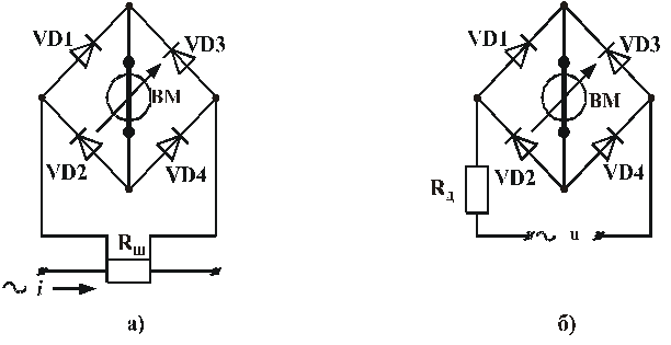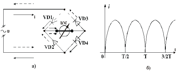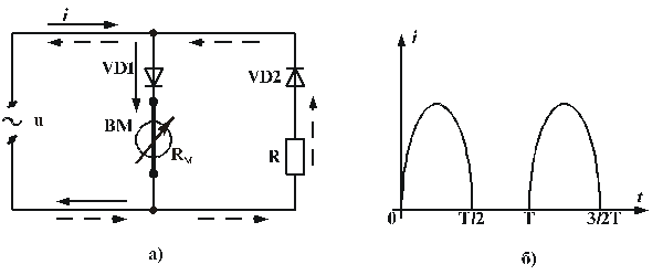 При використанні двопівперіодного випрямляча (рис.2.12, а ) струм через рамку вимірювального механізму проходить протягом обох півперіодів (рис.2.12, б ); в додатному півперіоді струм на рис.2.12, а протікає шляхом, позначеним суцільними стрілками, а в від’ємному півперіоді – штриховими стрілками, але через вимірювальний механізм ВМ струм в обидва півперіоди йде в одному напрямі.