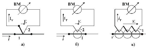 Термоперетворювач являє собою нагрівач 1 та термопару 2. Термопара може мати безпосередній електричний контакт з нагрівачем (рис.2.14,а ) і може мати тільки тепловий контакт з нагрівачем через електроізолювальний матеріал (рис.2.14, б та в ), який має високу теплопровідність. Контактні перетворювачі мають меншу інерційність, ніж безконтактні, але вони допускають великий витік струмів високої частоти і застосовуються на частотах не вище 5‑10 МГц. Безконтактні перетворювачі можуть використовуватись на частотах до сотень мегагерц. Крім того, безконтактні термоперетворювачі можна з’єднувати в батареї (рис.2.14, в ), що дозволяє підвищити чутливість приладу.