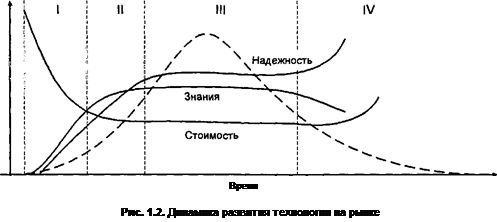 В качестве иллюстрации на рис.1.2 представлена динамика развития во времени технологии на рынке и соответствующее поведение ряда важных параметров, сопровождающих этот процесс. Эти параметры определяют возможность использования технологии в телекоммуникациях. К ним относятся параметр стоимости технических решений, средний уровень знаний связного сообщества о технологии, а также надежность технических решений.