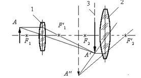 Простейшим микроскопом является двухлинзовый микроскоп. На рис.2. схематично показано как формируется микроскопическое изображение в системе двух собирающих линз. Первая из них - объектив, формирует действительное увеличенное изображение объекта АВ - А’В’.